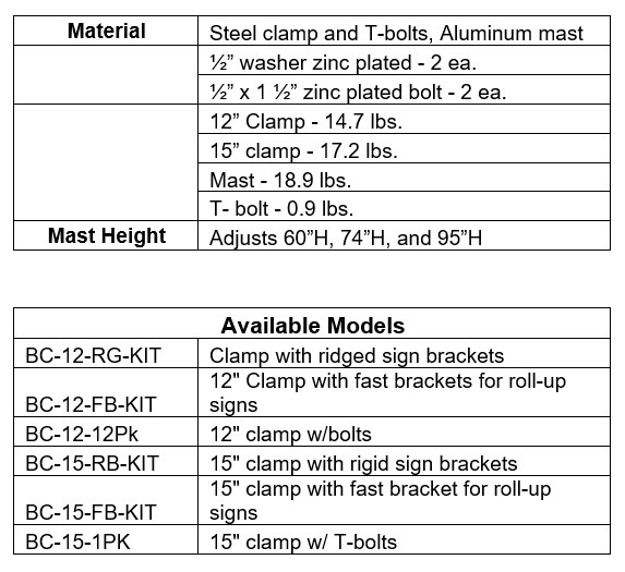 Assembly required, mast must be bolted to clamp with provided hardware. Includes Fast Bracket SH-RMQR for roll-up signs. 40.4 lbs.